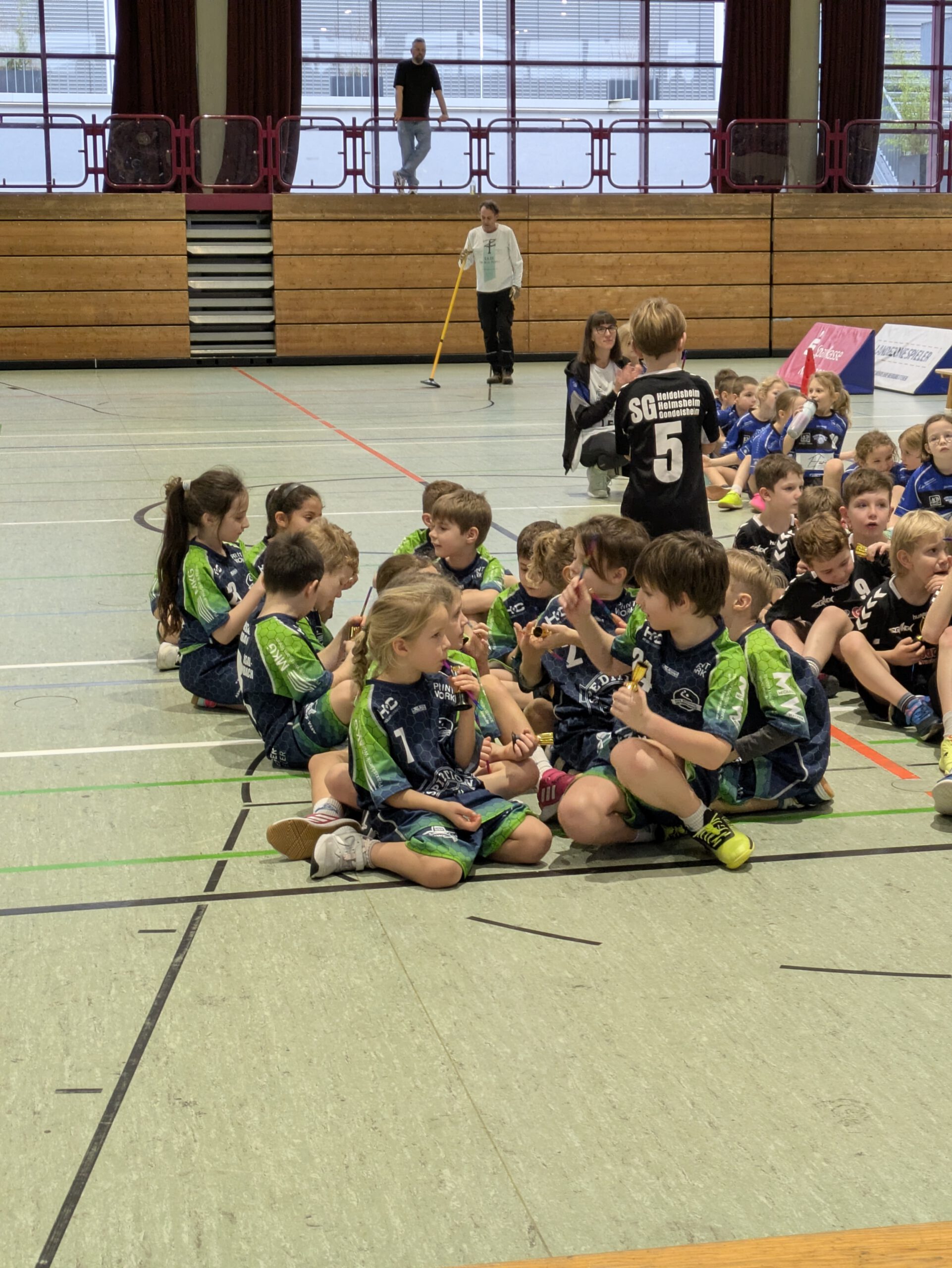 Zum letzten Spieltag in diesem Jahr fuhren 16 HSG Kids nach Neuthard. Nach der Begrüßungsrakete ging es stimmungsvoll in die Aufwärmrunde. Danach traten die beiden HSG Teams gegen die Mannschaften aus Neuthard, Knittlingen und Heidelsheim bei Minihandball und Aufsetzerball an. Alle konnten zeigen, was sie im Training geübt hatten. An den Bewegungsstationen konnten sich die Kinder austoben und in der Pause bei reichhaltigem Angebot stärken.