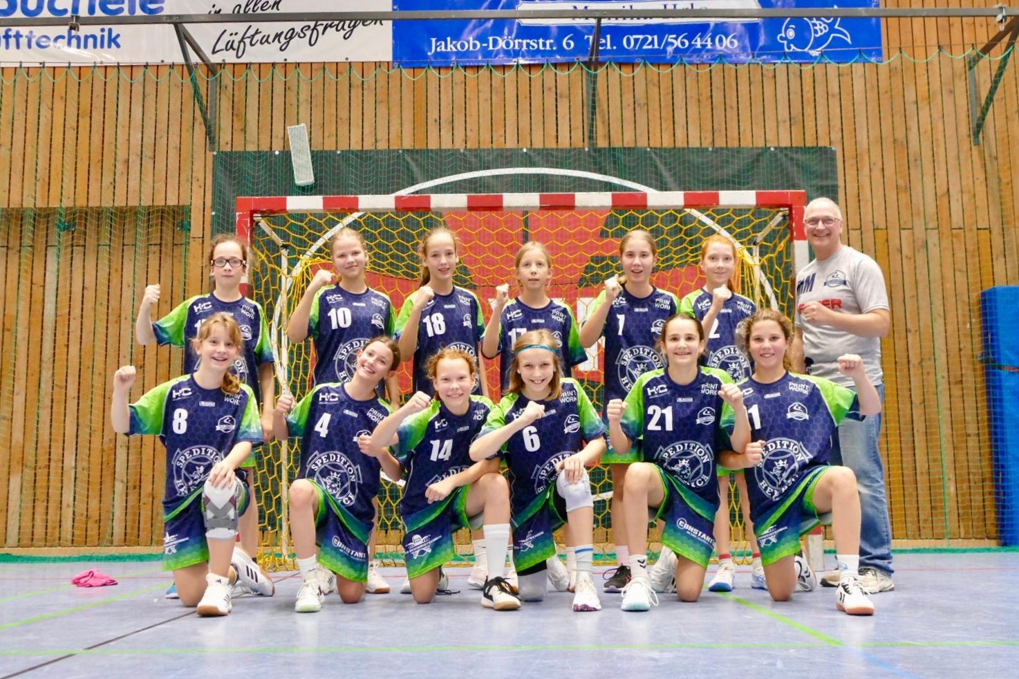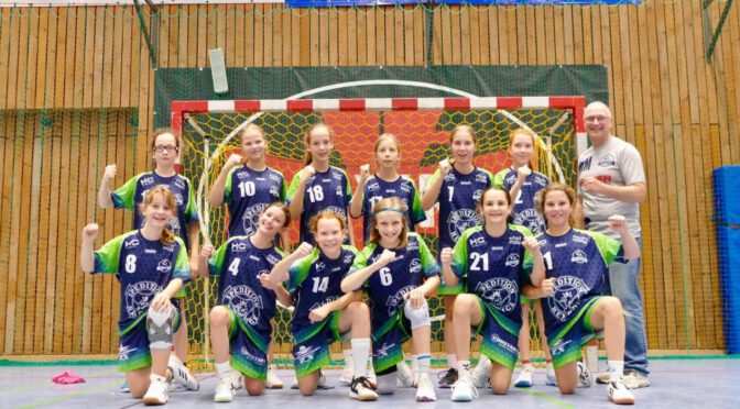 Gelungene Premiere der neuen Trikots im Spiel gegen Knielingen. Gegen die zweite weibliche D-Jugendmannschaft aus Knielingen gelang unserer Mannschaft ein ungefährdeter Auswärtssieg. Am Anfang gelangen uns v.a. Durchbrüche im 1:1 sowie immer wieder Anspiele auf die Kreisläuferin. Mit zunehmender Spielzeit wurde das Zusammenspiel sicherer und wir konnten auch durch Pass- und Laufspiel Tore erzielen. Da unsere Torfrauen nicht dabei waren, teilten sich vier Feldspielerinnen die Aufgabe und alle zeigten auch dort eine starke Leistung. Wir wechselten fleißig durch und nie gab es einen Bruch im Spiel. In der Abwehr waren die Spielerinnen konzentriert, konnten einige Bälle erobern und ließen keine leichten Tore zu.